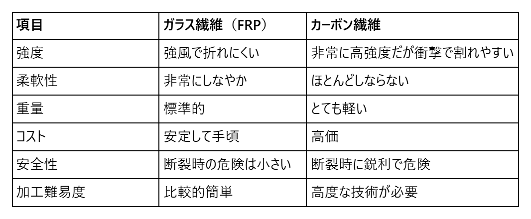 カーボン繊維と比べても、傘という用途にはガラス繊維が最もバランスが良い