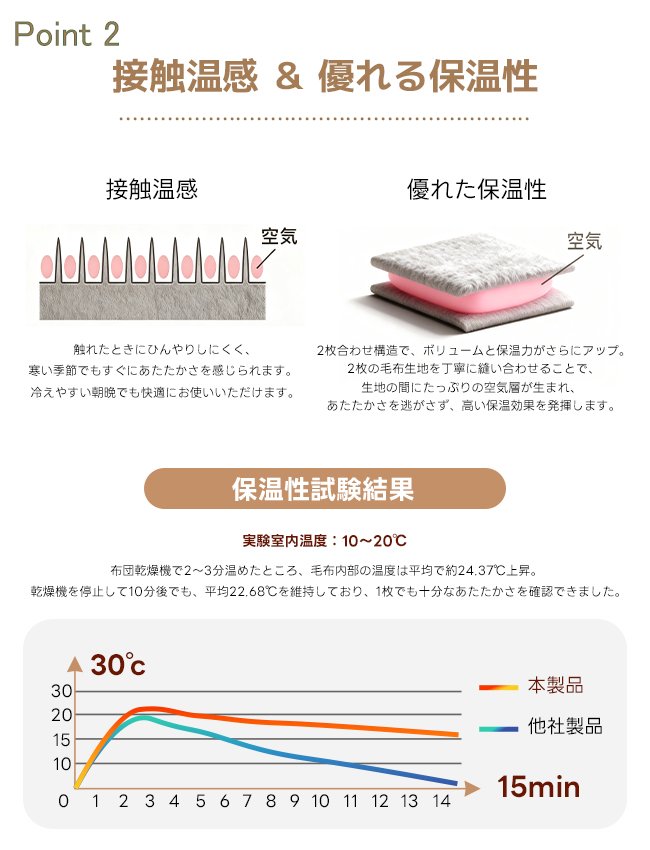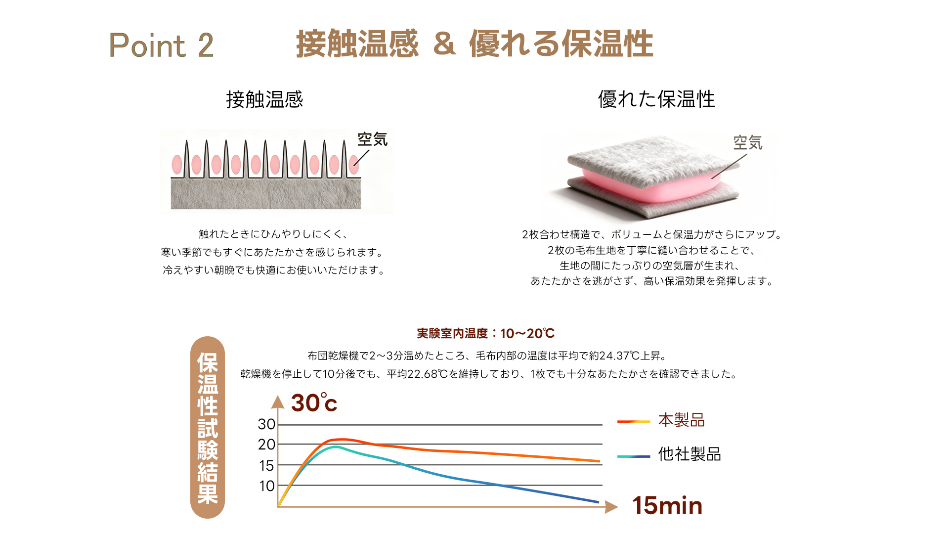 さらに、ウールを超える発熱力と優れた吸湿性で、長時間使っても蒸れにくく快適な心地よさが続きます。
