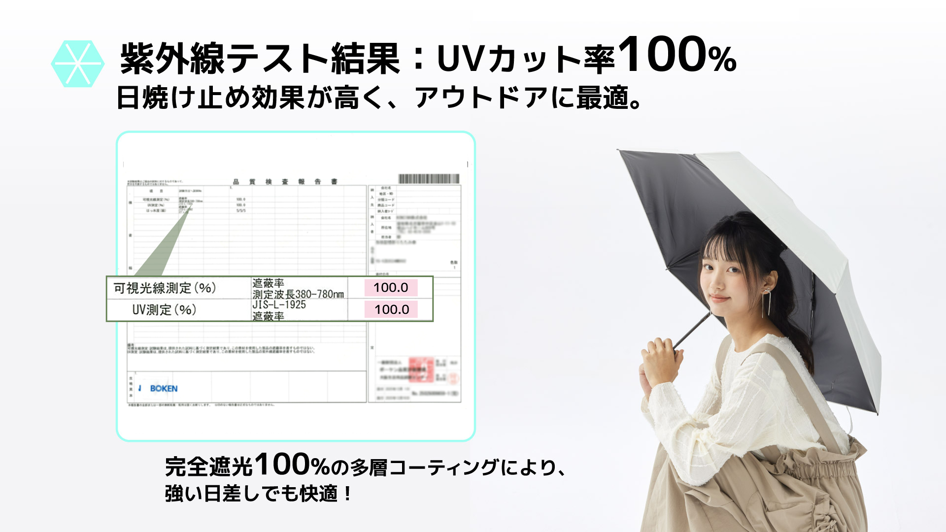 紫外線を100%カットし、遮熱効果で傘下の体感温度を最大−20℃まで抑制。真夏の強い日差しの中でも快適な日陰空間を演出します。