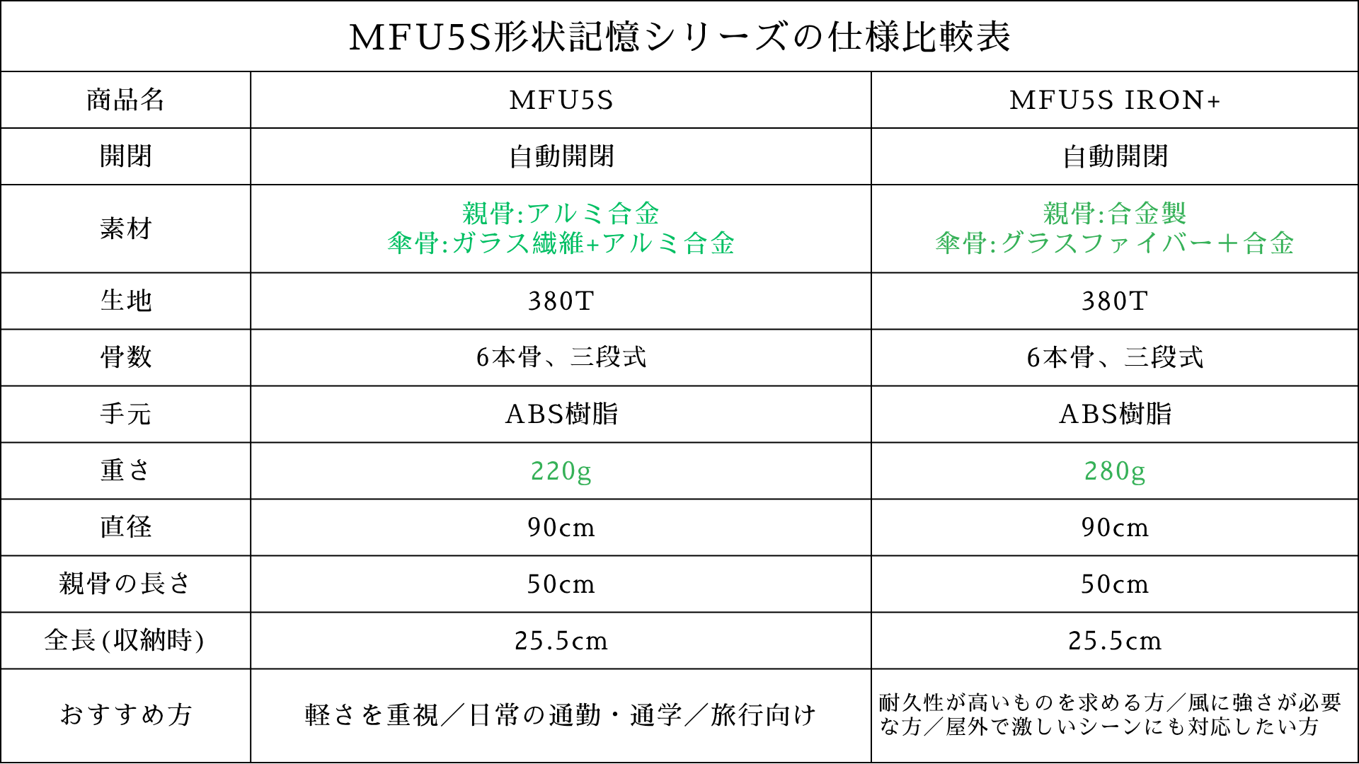 傘布には、380Tの高密度防水素材を使用しています。優れた防水性と速乾性を備えており、雨の日でもしっかりと水を弾きます。使用後の水滴も簡単に払えて、使い勝手の良さに自信があります。