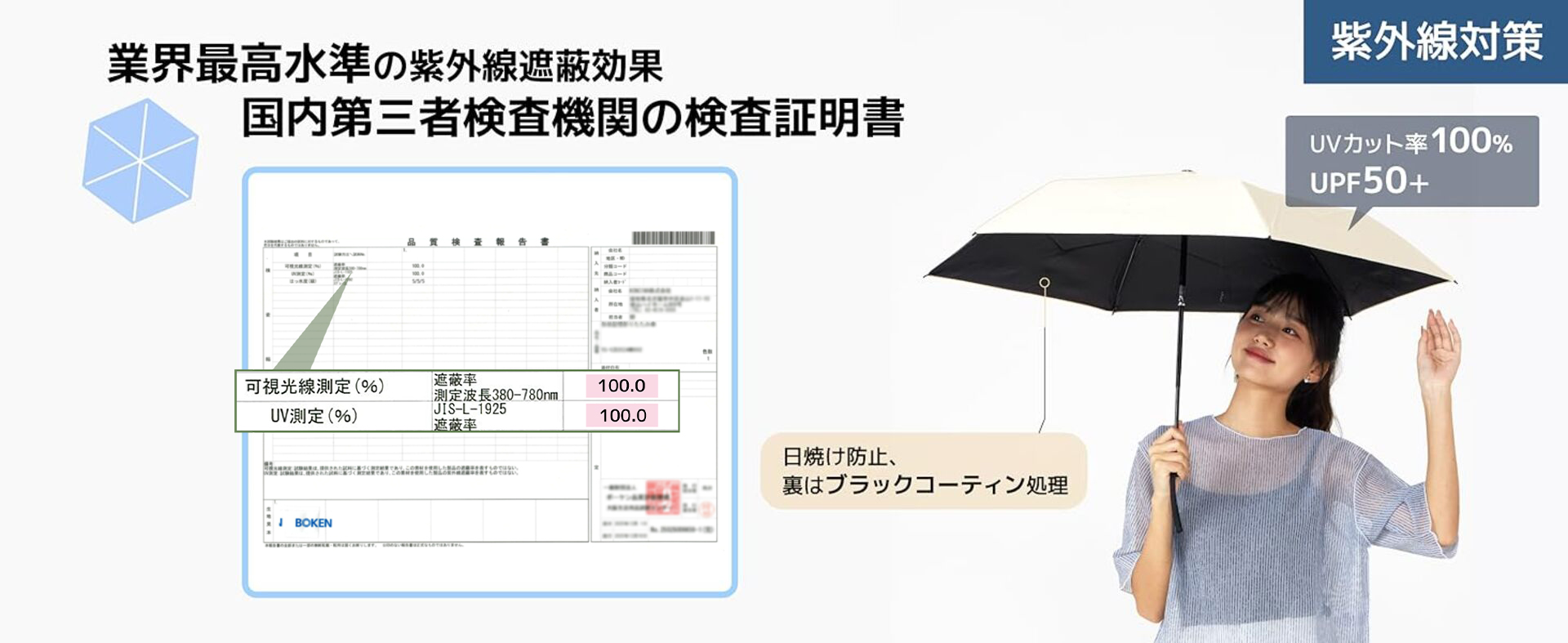 UPF50+の日焼け防止指数を誇り、紫外線を100%カットします。完全遮光仕様により、紫外線から肌をしっかり守り、日焼けを効果的に防げます。日差しが強い日でも、この傘があれば紫外線を心配せず、安心してアウトドアを楽しむことができます。