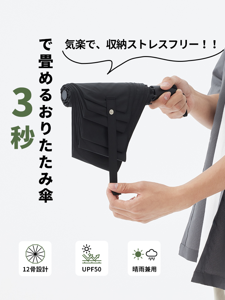 こちらの折りたたみ傘は、数千本の形状記憶糸と高温処理によって、美しいフォルムを長く保ちながら、「パッと3秒」で簡単にたため、使うたびに感じていた煩わしさを軽減します。通勤時や荷物の多い外出先でも、スムーズに扱える手軽さが魅力です。