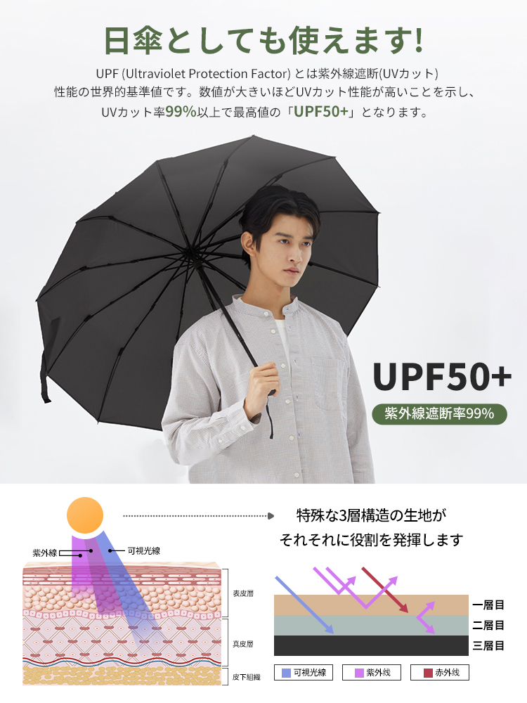 UVカット率99%以上の晴雨兼用仕様で、日傘としても雨傘としても一年を通して活躍。ビジネス、旅行、通勤通学、アウトドアなど、あらゆるシーンにフィットします。