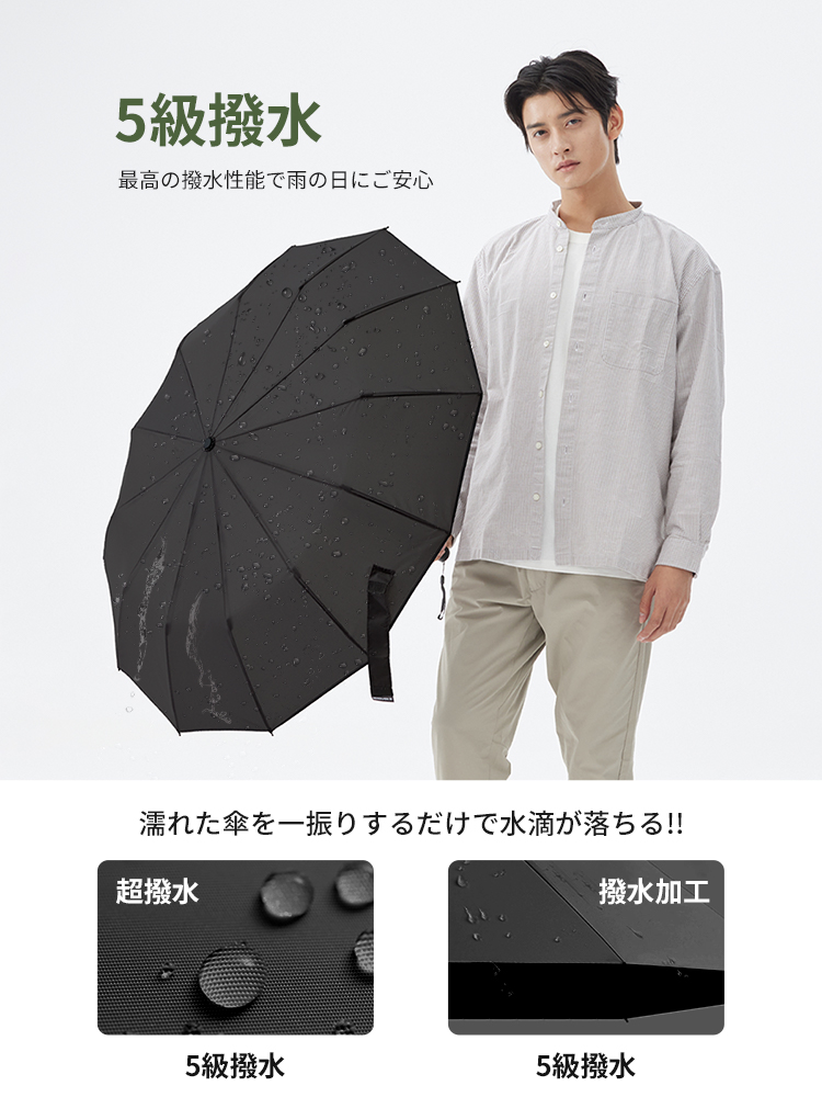 強風にも耐える12本骨の頑丈な構造で、風や雨にもしっかり対応。万が一ひっくり返っても簡単に元に戻せる安心設計です。さらに、直径約105cmの大判サイズなので、リュックやバッグを背負ったままでも全身をしっかりカバーできます。